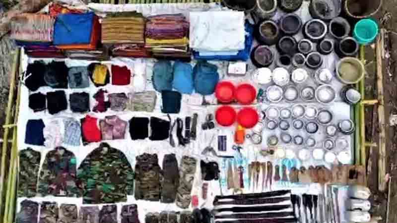 The team seized a variety of weapons and training equipment, including wooden rifle, sniper weapon components, military belts, cartridge belts, pouches, uniforms, boots, blankets, walkie-talkie chargers, solar panels and other logistics items used for training purposes.