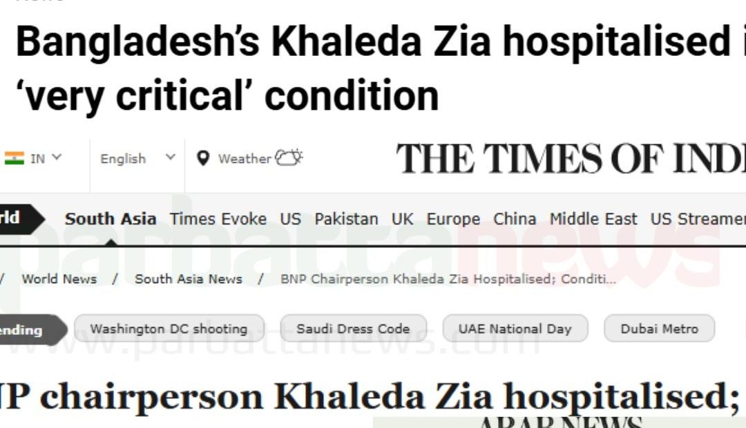 News of the grave illness of Begum Khaleda Zia, Bangladesh’s former prime minister and chairperson of the BNP, has drawn prominent coverage in international media, as she remains in what doctors describe as an “extremely critical” condition at Evercare Hospital in Dhaka.