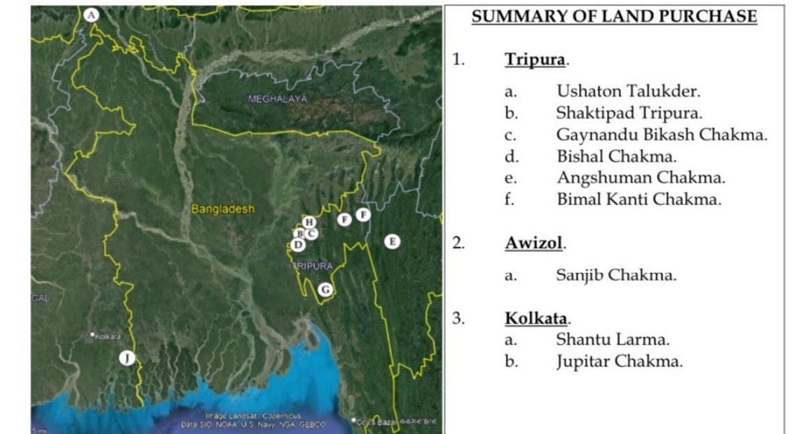 JSS (Santu) group leader and former Member of Parliament Ushaton Talukder, whose Indian name is “Bhavesh Deb Barma,” purchased two kani in Nandan Nagar, Agartala, Tripura, the documents state.