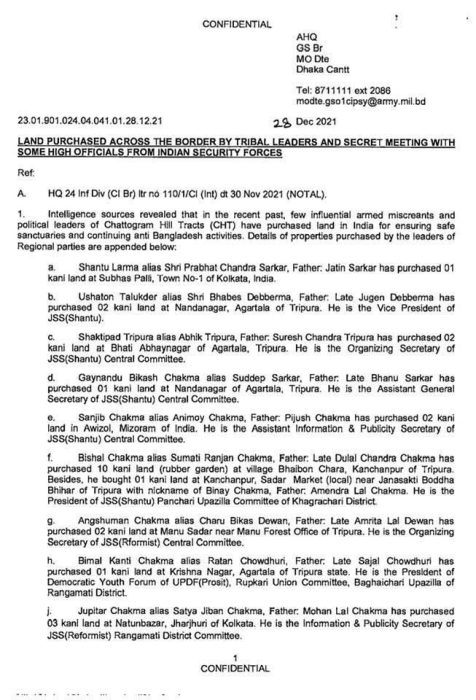 According to the leaked files, JSS leader Santu Larma, under the Indian name “Prabhat Chandra Sarkar,” bought one kani of land in Subhash Palli, Kolkata, West Bengal.