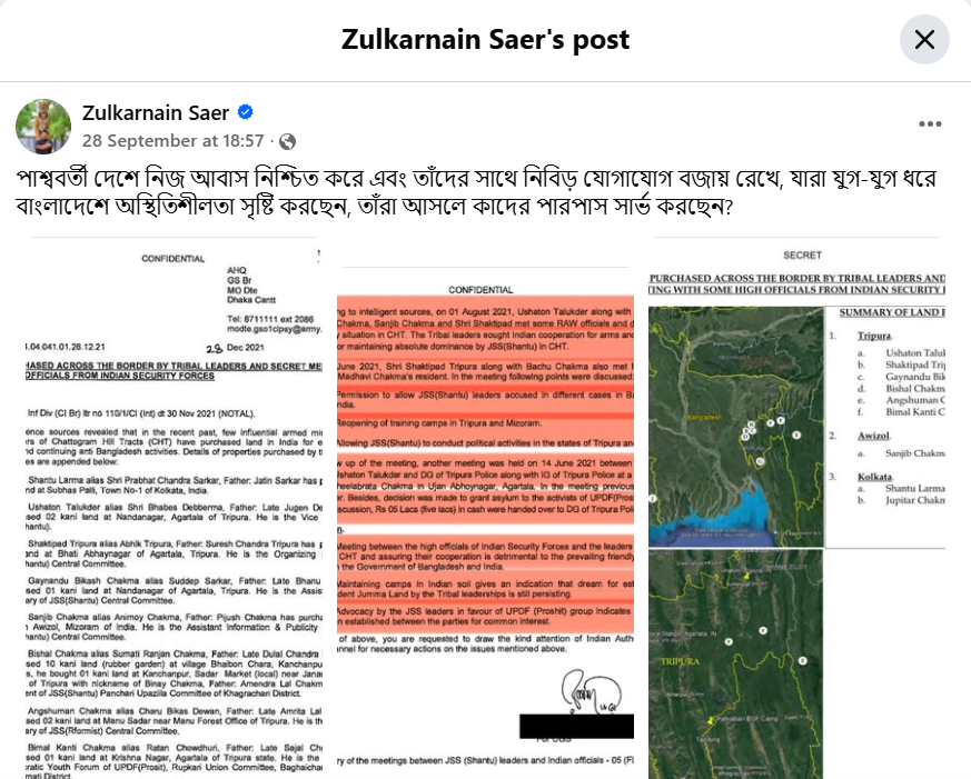 Secret documents have emerged alleging that nine senior figures of the separatist armed organisations Jana Sanghati Samiti (JSS) and the United People’s Democratic Front (UPDF) have purchased land in India.